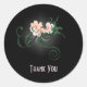 Um obrigado que você cola com uma ilustração de algumas delicadas flores cor-de-rosa florescendo com espirais verdes e folhas sobre um fundo preto com algumas cinzas de luz sombreando as flores para acentuar e iluminar. Obrigado escrito em uma fonte de deco de arte rosa claro.