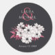 Estes elegantes adesivos de casamento redondos, redondos, de 3" x 3" apresentam um belo design floral em preto, magenta e branco sobre fundo preto com marcadores para os nomes dos primeiros casais e a data do casamento.