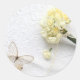 Um buquê de novas flores duplas de narciso amarradas com uma fita sobre um fundo texturizado, com uma bela borboleta clara. Parte de uma suíte de casamento com muitas peças correspondentes.