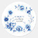 Flores azuis, chinoiserie, colante floral do batismo. Chinoiserie Baptismsticker floral azul elegante com um design de inspiração porcelana. Peônias graciosas no estilo tradicional de tinta em uma rica paleta de cobalto e índigo, acentuadas por realces brancos nítidos. O quadro circular de cor d'água floral deixa espaço para o seu texto.