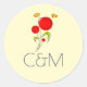 Os adesivos de casamento com as suas primeiras iniciais. Projetado com um desenho encantador de várias flores brancas e brancas, com corações gordos acoplados a um caule verde. 2 borboletas amarelas pairando perto. Desenhado com um contorno preto. Design Whimsical e fofo.