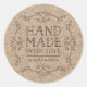 Adesivo rústico elegante com as palavras "Feito à Mão com Amor" entre floreios, tudo em cinza escuro contra um fundo com padrão kraft falso. Este adesivo rústico é ótimo para artesãos e criadores de produtos artesanais, como artistas, tricoteiros e costureiras. Pode ser usado ao presentear seus produtos artesanais ou como etiquetas de produtos.