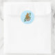 Um coelho marrom giro com flores cor-de-rosa contra um pano de fundo azul claro