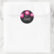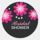 Flores cor-de-rosa em um adesivo preto com as palavras Chá de panela nele são perfeitas como selos para seus convites e seus favores de chá de panela.Elas são um toque na moda e pessoal para suas celebrações de chá de panela. Mais cores estão disponíveis neste design.