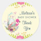 Obrigado por um chá de fraldas ou outra ocasião com um nome personalizado. Projetado com elementos florais cor-de-rosa e verdes ao longo da fronteira. Ilustrado com uma gira de ovo aquoso sentada a dentro de uma cesta marrom de vime. A cesta é decorada com fitas, arcos, flores e pequenos corações também. Um flamingo cor-de-rosa e coelho branco parado perto. Fundo amarelo.