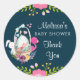 Obrigado por um chá de fraldas ou outra ocasião com um nome personalizado. Projetado com elementos florais cor-de-rosa e verdes ao longo da fronteira. Ilustrado com uma gira de ovo aquoso sentada a dentro de uma cesta marrom de vime. A cesta é decorada com fitas, arcos, flores e pequenos corações também. Um flamingo cor-de-rosa e coelho branco parado por perto.