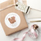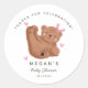 O tema do urso chá de fraldas favorece o adesivo com ilustração desenhada à mão de um filhote com arco e corações cor-de-rosa. O texto diz "obrigados para comemorar!" Perfeito para o chá de uma garota.