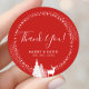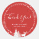 Adesivo Redondo Clássico Floresta de Inverno Rústica Veado Vermelho Obrigado. Lindos veados da floresta de inverno na neve com luzes de cordão e pinheiros.