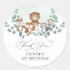 Este adesivo de moda redonda apresenta uma coroa macia de eucalipto verde e um grupo de adoráveis animais florestais.