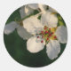 Fotografia de uma flor branca de pera com anteras vermelhas. Em um adesivo redondo, perfeito para uso como selos de envelopes.