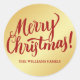 Feliz Natal está escrito em um roteiro ousado e festivo sobre um fundo de ouro liso. Seu nome está escrito abaixo em letras simples. Além de selar envelopes com eles, você pode adicioná-los ao empacotamento de presentes.