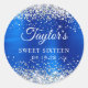 Crie seus próprios adesivos de bondade de festa de aniversário Doce 16. Garota cintilante prateada cintilante em um gráfico de arte digital azul real, em aço inoxidável, estilo metal laminado. Personalize os estilos de fonte para criar o seu próprio adesivo design para sua celebração especial. Uma caligrafia elegante clássica emparelhada com uma fonte serif de todos os bonés.