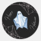 Adesivo preto redondo com fantasma de lençol branco e teias de aranha. Use como selo assustador perfeito em seus convites de Halloween e convites com tema gótico! Ótimo para artesanato de Halloween, embrulho de presente, decoração do seu planejador e scrapbooking. O texto pode ser personalizado como desejar ou removido completamente usando a Ferramenta de Design.