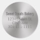 Este adesivo de padaria personalizado tem texto que você pode alterar para a mensagem desejada, como nome, endereço e número de telefone da empresa. O fundo é uma renderização de artista para se parecer com metal escovado, mas o adesivo não é um produto de folha de alumínio.