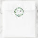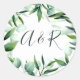 Este adesivo redondo apresenta iniciais de estilo manuscrito rodeadas de folhagem verde de eucalipto sobre fundo branco puro. Isto é parte de uma suíte de casamento. Você pode alterar as iniciais no menu personalizar.