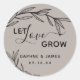 Adesivo de pedra terroso com folhas de louro, deixa o amor crescer em escrita e fonte moderna. Ótimo para selo de lembrancinha de casamento