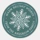 Etiquetas de presentes de inverno ou selos de envelopes com um floco de neve branco, branco, folk art e texto personalizável "desejos de feriados quentes" num fundo verde-pinheiro.
