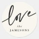 Selo redondo de adesivo/envelope com a palavra 'amor' em uma fonte de letra manuscrita. O resto do texto é completamente personalizável - então o estilo da fonte, tamanho, cor e posicionamento podem ser alterados. A cor do fundo também pode ser alterada usando as ferramentas de edição do Zazzle. Este design está disponível em diferentes cores e em outras formas/tamanhos de adesivos na minha loja.