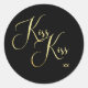 Fonte de texto dourado estiloso com a frase "Kiss Kiss" e dois xx abaixo das palavras. A fonte dourada é uma imitação de folha dourada e está sobre um fundo preto. A caligrafia é um estilo elegante e minimalista com um xx duplo sem serifa. Fonte de texto elegante minimal dourado Kiss Kiss Adesivo redondo clássico.