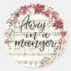 Longe em um adesivo de Hymn Natal Manger Apresenta o hino "Longe em um mangueiro e um design de aquarela.