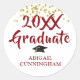 Script moderno de pincel manuscrito 20XX FORMANDO favorece autocolantes ou selos de envelope com configuração de brilho dourado e cartão vermelho personalizado com o nome do formando e ano de graduação. Entre em contato com o designer por meio do Zazzle Chat ou makeitaboutyoustore@gmail.com se você quiser que este design seja modificado, em outro produto ou quiser coordenar itens.