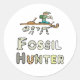 Fossil Hunter gráfico mostra um colecionador perspicaz examinando parte de um fóssil com os restos ainda enterrados abaixo do solo. Abaixo estão as palavras "Fóssil Hunter" com as letras ocasionalmente quebradas como um fóssil poderia ser. Uma design divertida para fãs caçadores de fósseis.