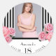 Elegante, glamouroso e feminino para a 18ª festa de aniversário de uma menina. Listras verticais negras e brancas clássicas e esbeltas. Decorado com flores, peônias e rosas cor-de-rosa. Modelos de nome, idade 18, data de nascimento e data do aniversário. Modelo para sua própria foto vertical. Menina e elegante!