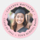 Adesivos de formatura com sua foto dentro de uma moldura ondulada e seu texto personalizado em volta da foto. Texto preto em fundo rosa ou cor personalizada.