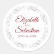 Estes elegantes adesivos de casamento apresentam texto vermelho rico em um fundo branco com uma borda floral de folha fina prateada. O texto é totalmente personalizável e contém os nomes dos casais de casamento e a data do casamento. Excelente como etiquetas de favor ou selos de envelope!