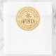 O desenho central apresenta uma ilustração estilizada de abelha melífera. Personalize com o nome da sua apiária, endereço e descrição do mel (cru, engarrafado à mão, fonte única, etc.). Inclua também o peso líquido do seu mel. Conversões comuns de peso líquido de mel: 8oz (227g), 12oz (340g), 16oz (454g), 32oz (907g), 5lb (2,27kg).