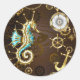 Adesivo Redondo Fundo de madeira com cavalo de mar mecânico