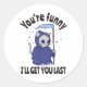 Engraçado e assustador design do Dia das Bruxas com um gato engraçado da Grim Reaper segurando uma cicatriz e dizendo "Você é engraçado, eu te pego por último". Um jogo perfeito para a celebração do Dia das Bruxas, assim como para o uso diário.