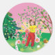 Adesivo Redondo garota com flores contra fundo paisagístico
