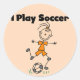 Uma jogadora de futebol de vara em um uniforme de futebol laranja e texto que diz "Eu jogo futebol" em T-shirts, capas de futebol, tampas de tanques, canecas, cartões, adesivos, ímanes e outros roupa de futebol e presentes.