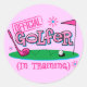 Esta design bonita é perfeita para qualquer aspirante a pequeno golfista ou campeão de Mestrados, especialmente se ela tem uma Pai, Mamãe, vovô ou vovó que golfe. Carimbo oficial, clube de golfe e bola de salto, e flores em pinks brilhantes. O texto diz OFICIAL GOLFER (EM TREINAMENTO). presente de excelente para bebês ou crianças em T-shirts, roupa, sacos de tote e muito mais! PinkInkArt original!