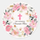 Este moderno e elegante autocolante apresenta uma bela coroa floral de flores cor-de-água de jardim rosa em volta de uma cruz rosa, perfeita para a primeira comunhão sagrada da sua filha. Itens CORRESPONDENTES disponíveis em nossa loja.