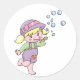 Um design antigo com uma garotinha vestindo um chapéu lilás e um pouco de calções soprando bolhas de sabão de um tubo de bolha.