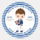 Este adesivo redondo clássico está em cores azul, marinho e branca. O adesivo foi projetado com um menino giro e morena segurando bíblia. Este clássico marinheiro espanhol é ideal para o menino, primeiro comunhão sagrado, para os obrigados. Você pode manter o texto ou alterá-lo para seu próprio texto clicando na opção PERSONALIZAR.