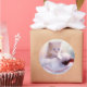 Um adesivo com uma fotografia de um gatinho gengibre sentado sobre um chapéu branco e vermelho de Papai Noel. Luzes brilhantes turvas nos fundos. Um trocadilho engraçado. O texto é editável para que você possa mudá-lo, então diga o que quiser.