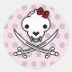Peguem este clássico adesivo redondo fofo com este desenho animado e assustador de um Caveira Pirata e Ossos do Gatinho Jolly. O fundo é cor-de-rosa pálido com uma bolinhas de cinza. E por que não haveria um Pirata de Gato? Um crânio de gato e ossos não são bonitinhos para piratas de gatos? Jolly Gatinho é, é claro, uma peça sobre Jolly Roger, os piratas do crânio e da bandeira dos ossos mostram suas vítimas enquanto as perseguiam. Fiz duas versões. Um baseado em um crânio real de um gato e um mais bonito em uma versão de manga. Como fundo, escolhi preto sinistro, vermelho de sangue e rosa feminino. Embora a crista seja famosa como "crânio e ossos", escolhi dois sabres curvos em vez de ossos. Porque eu acho que sabores parecem legal.