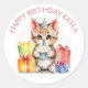 Adorável e personalizado, o Feliz Aniversário gatinho temático para selos de envelope ou selos de festa de aniversário. Um doce gatinho aquoso segurando um cupcake cercado por presentes de aniversário.