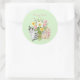 Adesivo fofo e adorável com gato, coelho e um buquê de primavera. Fundo verde e cores suaves.