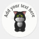 Um gatinho preto e branco de desenho animado, com orelhas cor-de-rosa e olhos verdes. Acima do gato está uma modelo para você adicionar seu próprio texto e personalizar esses adesivos adoráveis.