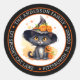 O mais fofo gatinho preto vestindo um chapéu de bruxa adornado com flores e segurando uma abóbora pop em design circular de endereço de retorno. Apresenta lindas flores laranja e um fundo de aquarela tingido de cor de damasco com algumas estrelas espalhadas pelo céu. Basta personalizar com seu nome ou nome da família e endereço de retorno, cidade, estado e CEP.