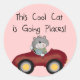 Um gato num carro vermelho e um texto que diz "Este Legal Gato está Indo aos Lugares!" em camisas de design de gato, canecas, cartões, adesivos, sacos de tote, chaveiros e outros itens.