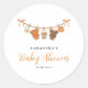 Gender neutral clothesline Halloween baby shower classic round sticker. Easy to change the text. Cute watercolor baby clothes and pumpkin for a Halloween baby shower.