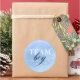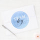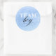 Este adesivo revelador de gênero apresenta o texto "garoto da equipe". O simples design oferece um roteiro de caligrafia em um fundo de aquarela azul. Faça seus convidados preverem um bebê vestindo este adesivo do time.