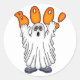 Um pequeno fantasma vestindo calçados e texto cor de laranja que diz "BOO" aparece no truque do Halloween ou trata sacos de tote, T-shirts, canecas, botões e outros itens temáticos do fantasma.