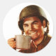Imagem divertida do Soldado com um sorriso grande segurando uma xícara de café como se dissesse "Saúde". Quaisquer arranhões ou imperfeições são da imagem original da safra e não são criados pelo design gráfico.