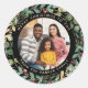 Estes belos adesivos fotográficos de férias apresentam uma exuberante e festiva coroa de folhas de ouro, verde de Natal e bagas brancas em um fundo preto moderno. Sua foto pessoal de casamento ou de família vai para o centro.
